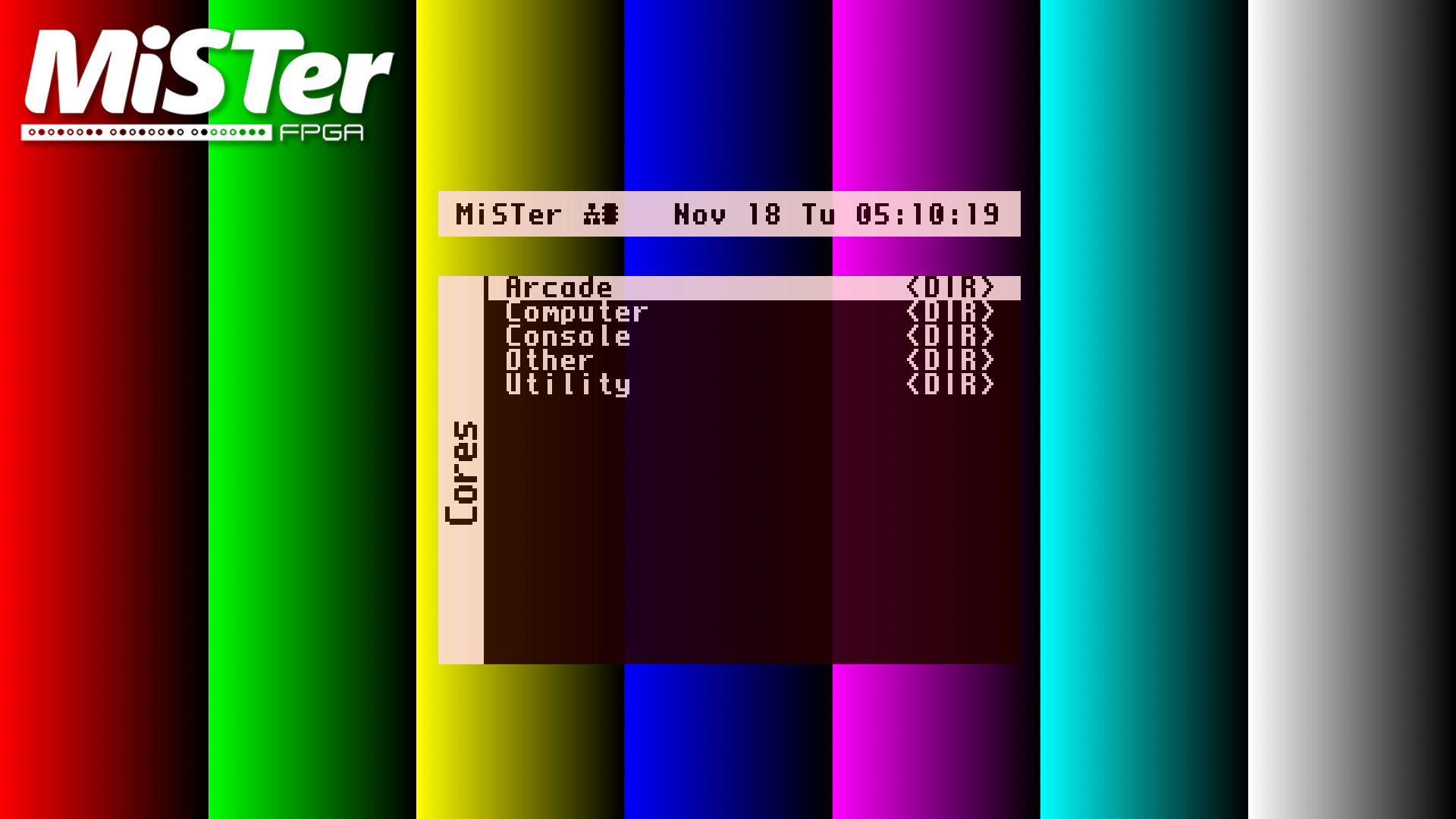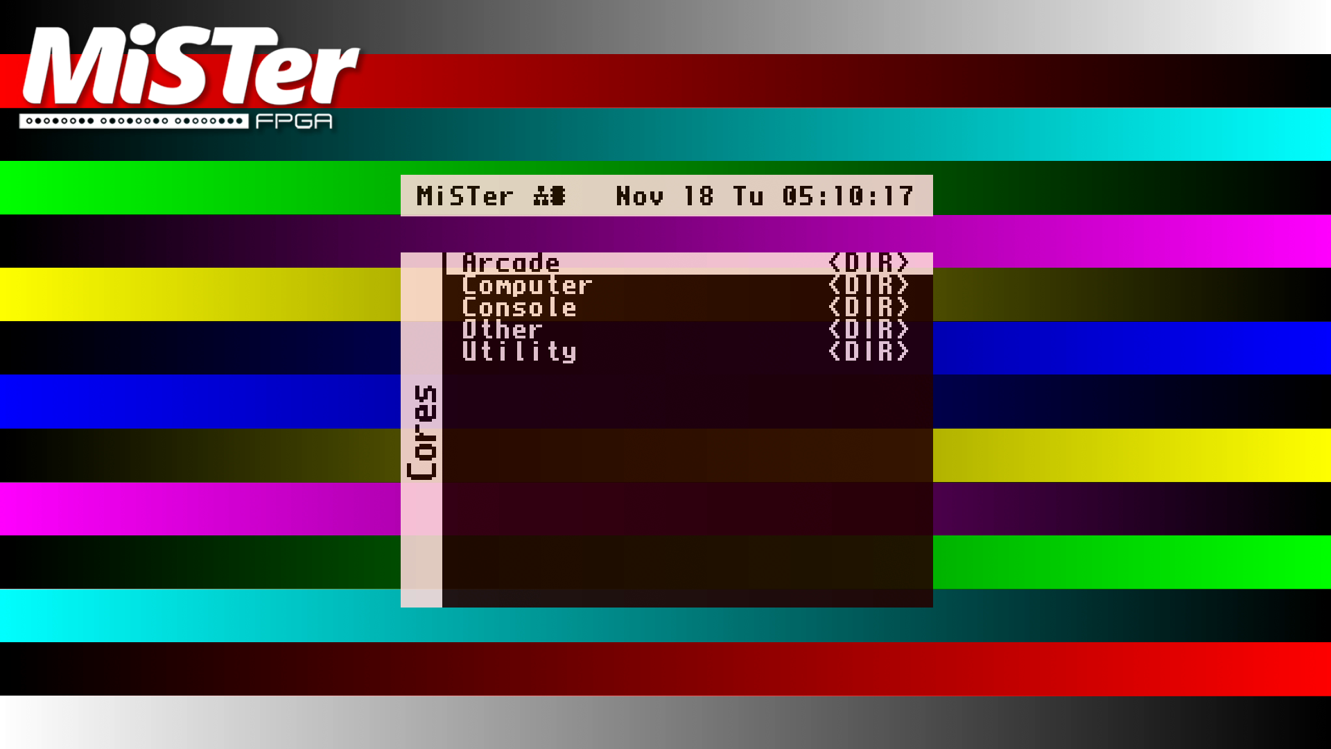 MiSTer FPGA 의 메인 메뉴 UI 화면에서 기본 배경은 아날로그 TV 노이즈가 보이는 화면이