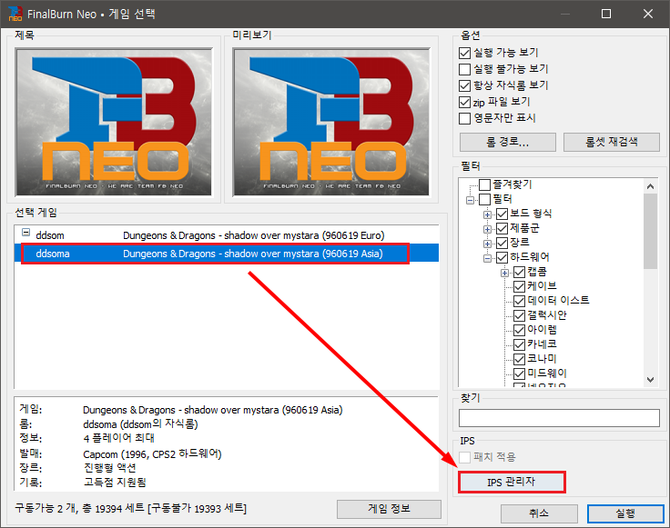 IPS 패치를 적용할 게임을 선택하고 "IPS 관리자" 버튼을 누릅니다.