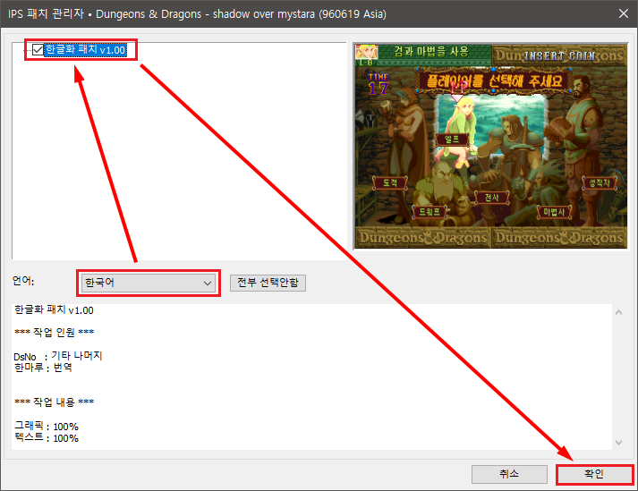 언어를 한국어로 선택 → "한글화 패치" 체크 → "확인" 버튼을 누릅니다.